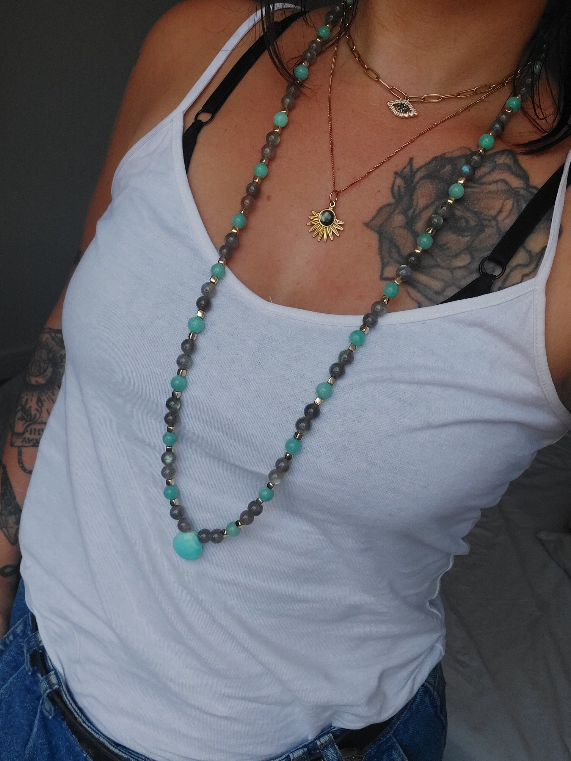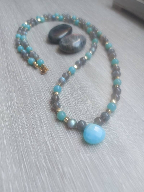 Sautoir en labradorite, amazonite & aragonite bleue