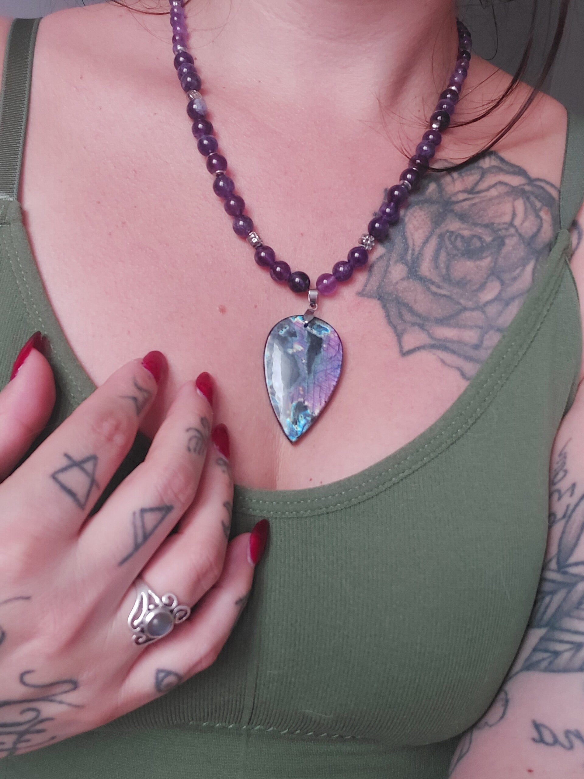 Composé d'une grande spectrolite de 4,6 cm sur 2,8 cm, et de perles d'améthyste en 6 & 8 mm, ce collier à été spécialement conçu pour vous aider à apprivoiser vos pouvoirs psychiques tout en vous protégeant.