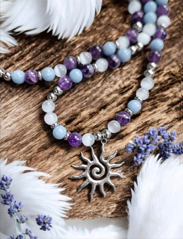 🪽 L’angélite, bleue comme une plume tombée d’un ciel bienveillant, y apporta son souffle d’apaisement. Elle relie aux guides, aux murmures subtils, à la paix qui circule entre les mondes. Elle adoucit les mots, harmonise les relations, et rappelle que chaque être porte en lui une étincelle de douceur céleste.