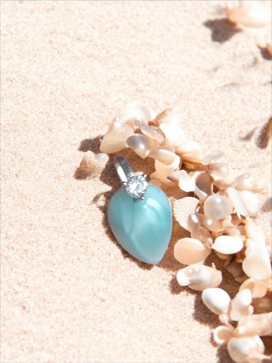 Dans le creux de ce pendentif repose un fragment d’océan ancien, une goutte de ciel tombée dans la matière pour apaiser les cœurs fatigués.