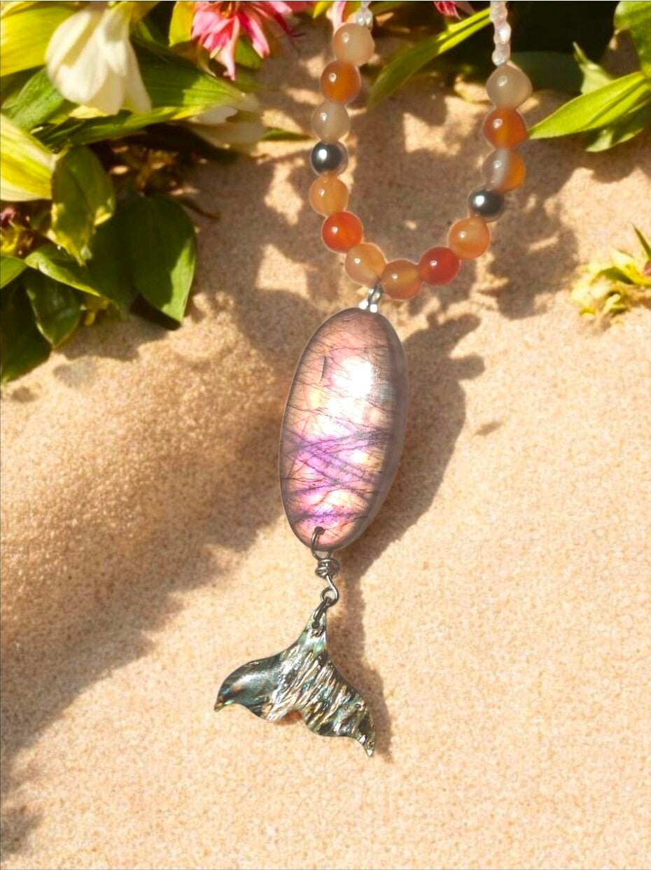 Sa labradorite rose‑orangée porte le reflet d’un soleil naissant, celui qui réchauffe le cœur et réveille les intuitions endormies. Elle murmure que chaque femme est un horizon en mouvement, un souffle de magie qui change de couleur selon ses émotions.