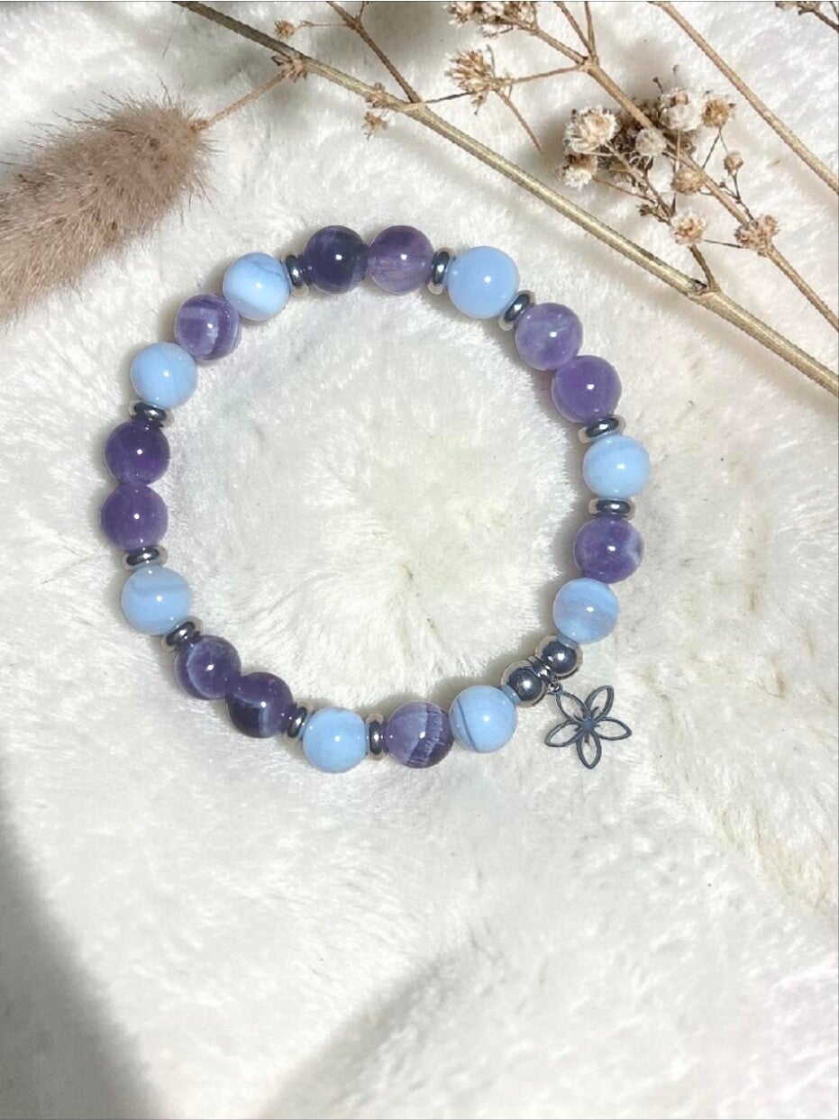 Porter ce bracelet, c’est porter un jardin intérieur: un lieu où le violet et le bleu se mêlent comme deux pétales qui s’ouvrent ensemble, où la fleur centrale murmure que la beauté naît toujours de la douceur.